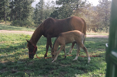 Born at 11:30 a.m. on August 5th, Graham of Montrose surprised us all. Never expecting to get a buckskin out of our chestnut mare, there he was in all his glory! He is 1/2 Arab and 1/2 quarter horse. Brave Heart is his sire and his dam is Rominant or “Pumpkin” as she is known. My sister Sally Gronauer received naming privileges and she named him “Monty” for our Scottish ancestors’ clan. He is a sweetheart! We love him!