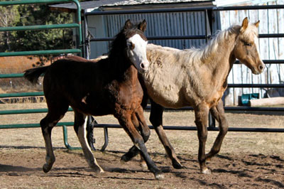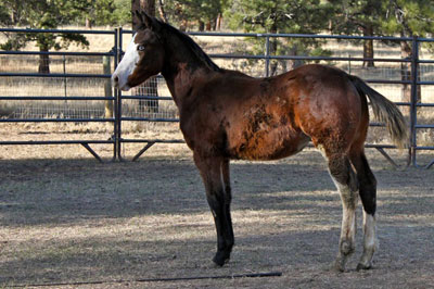 What a pretty baby this is! He is a bay overo colt out of our paint Cinmax Scotch Tomy and Pawnee Brave Heart. With two completely blue eyes, he is such a striking colt. And on top of everything, his disposition is golden. He imprinted us with his friendliness! We love him and know that he will be an outstanding horse when he grows up.