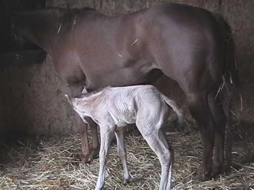 This foal was born just last night, April 17 at 1:45 a.m. The mare is My Invitation and is owned by Sue Pawley. Kassy is this foal's nickname. When I know her official name I will let you know. Kassy seems to be a buckskin. Hurrah for Brave Heart!